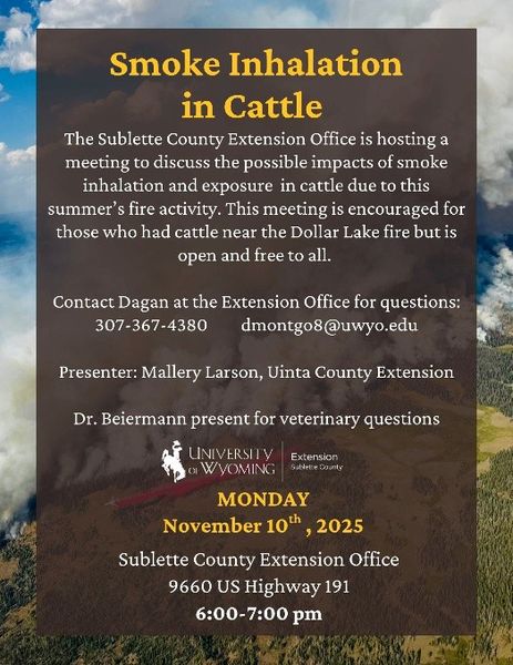 The Sublette County Extension Office is hosting a meeting to discuss the possible impacts of smoke inhalation and exposure in cattle due to this summer’s fire activity. The presenter is Mallery Larson from the Uinta County Extension office. Presenter will be Mallery Larson, Uinta County Extension. Dr. Bob Beiermann will be present for veterinary questions. The program will be at the SCEO, 9660 US 191, from 6-7PM. This meeting is encouraged for those who had cattle near the Dollar Lake Fire but is open and free to all. For questions and more information, 307-367-4380, dmontgo8@uwyo.edu.